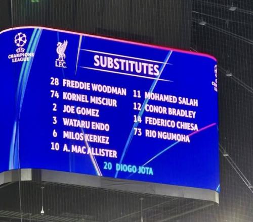 雷速体育10月23报道 欧冠联赛阶段第三轮,利物浦客场挑战法兰克福。半场结束利物浦3-1领先法兰克福。比赛中出现暖心一幕,法兰克福主场的大屏幕显示利物浦替补球员时,加入了今夏不幸离世的若塔的名字。