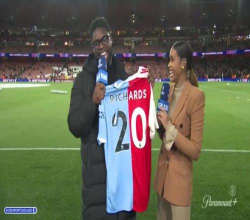 此前曾透露自己私下也支持阿森纳的曼城旧将理查兹在节目直播中收到了一件阿森纳与曼城的缝合球衣。